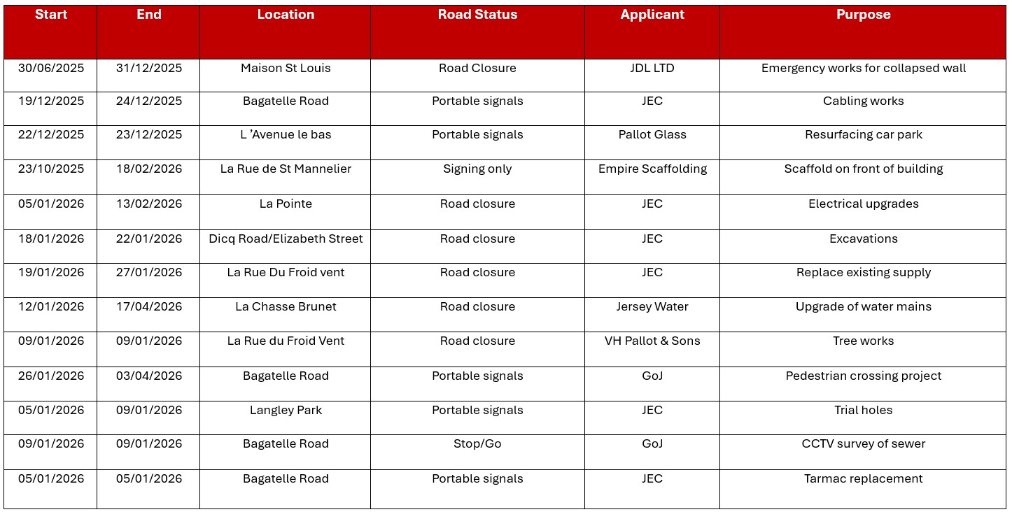 The latest planned roadworks, closures and road safety improvements information for the Parish of St Saviour Road Network Report is available below;