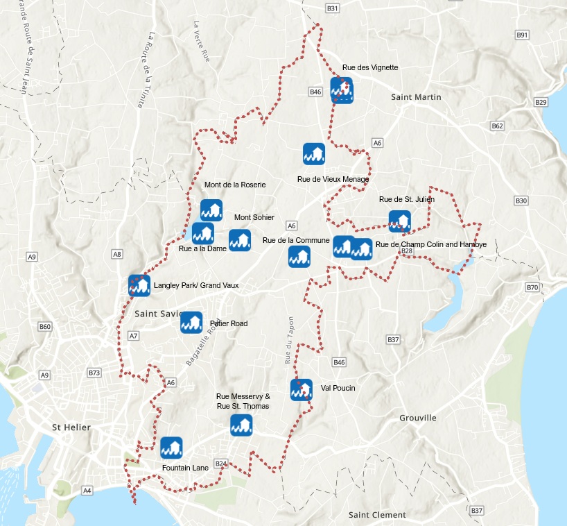 The Parish team is currently checking gulleys and drainage systems and will continue to monitor updates from Jersey Met closely. Particular attention is being given to areas including Grands Vaux, Rue des Pigneaux, Rue de la Vignette, Rue Messervey, Rue à la Dame, Champ Colin, Rue de Hambie and Rue de Vieux Menage.