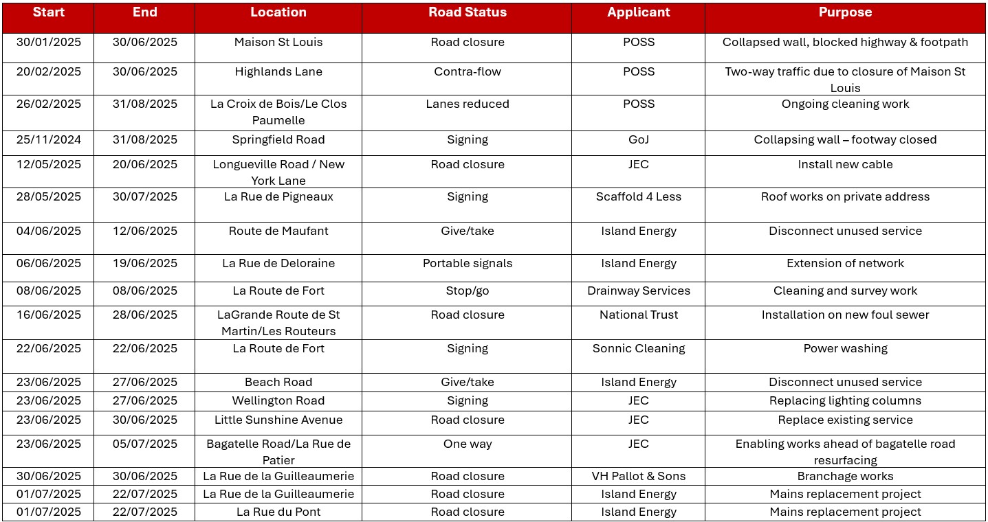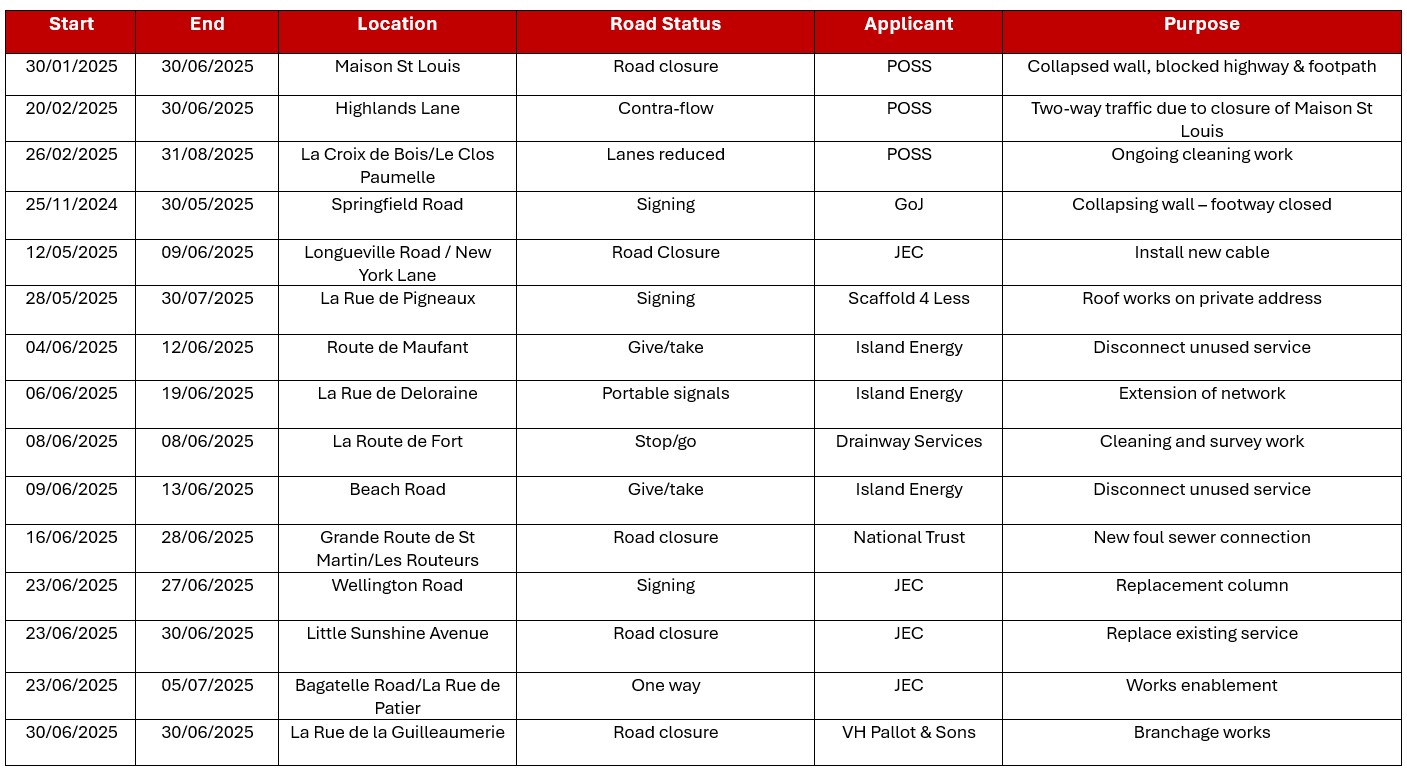 The latest planned roadworks, closures and road safety improvements information for the Parish of St Saviour Road Network Report is available below;