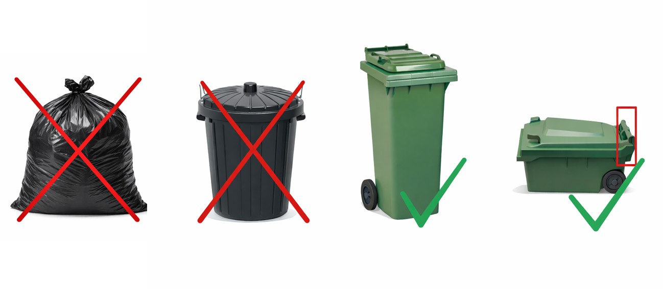 To ensure the safety of our waste collection personnel, refuse and glass recycling bins will only be collected if they are wheelie bins equipped with lifting arms and have a capacity ranging from 140 to 240 litres. Larger bins will be accepted provided they are fitted with a lifting arm.